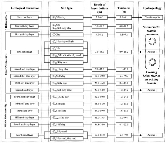 The geological and hydrogeological formation of each layer within the surveyed depth is described in the following. The top deposit is a top crust layer composed of silty clay, which is a phreatic aquifer with a groundwater level of 0.5–2.8 m below the surface. Following is a soft clay layer (the first soft clay layer). The top crust layer and the first soft clay layer were formed in the Holocene period. Next is a stiff clay layer (the first stiff clay layer). Underlying the first stiff clay layer is the first sand layer, which is mainly composed of silt and silty sand. Most normal metro tunnels are built in the first sand layer, and it is a low-pressure artesian aquifer (I1) with a groundwater level of 3.15 to 5.45 m. The following layer is the second soft clay layer, which is a saturated and plastic layer with a high clay concentration. The second soft clay layer is the softest layer in Changzhou, where many below river crossing tunnels are built and are very sensitive to disturbance. The next layer is the second stiff clay layer, in which some below the river crossing tunnels are also built. The following are the third soft clay layer and the second sand layer, which are the deepest excavation positions for the EPB shield machine. The second sand layer contains a silt sublayer (⑧1) and a silty sand sublayer (⑧2). They are the second low-pressure artesian aquifer (I2), with a groundwater level from 4.23 to 8.13 m. Top to bottom, layers from the first stiff clay to the third soft clay layer were formed in the upper Pleistocene period, and they are the densely distributed areas of the metro lines. Deeper areas include several similar layers, such as soft clay layers, sand layers, and stiff clay layers, which were formed in the middle Pleistocene period, and they are usually located deeper than metro tunnels.