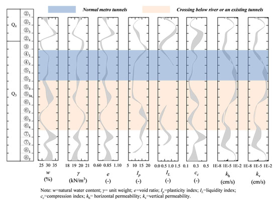 Figure 3 shows the geotechnical parameters of the water-rich soft strata in Changzhou. The physical parameters, including water content, unit weight, void ratio, plasticity index, and liquidity index, were determined using laboratory tests conducted in accordance with the Chinese standard [15], which is identical to the British Standard [16]. The compression index was determined using a normal oedometer test. Layers ⑤ and ⑧ are classed as sandy layers by the Unified Soil Classification because of their high sand content. The other layers with a significant silt concentration are classed as the clay layer. The permeability of clayey soils was determined using oedometer testing, and the permeability of the sandy soil was determined using pumping testing.