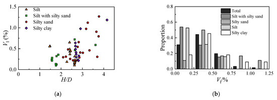 Figure 4b shows the statistics of the distribution of Vl for different ground types. What can be noticed is the fact that the silt with silty sand layer and silt layer shows no strong, obvious distinction. In general, most Vl induced in these layers is below 0.75%, with half of the results between 0 and 0.25% and 30% of the results between 0.25% and 0.50%. Not surprisingly, the Vl induced in silty sand is slightly higher than that in the silt layer, with more than 40% of the Vl exceeding 0.50%.