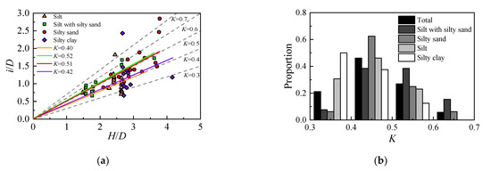 Based on the data points of 59 cross sections, the relationship between trough width i and buried depth H for different soil types, in comparison with different reference lines of trough width parameter K, is shown in Figure 5a. For a common presentation, the buried depth H and trough width i were normalized by the tunnel diameter D. Based on linear regressions, the average value of trough width parameter K for each soil layer was estimated as follows: silt: K = 0.40, slit with silty sand: K = 0.52, silty sand: K = 0.51, and silty clay: K = 0.42. As can be observed, most data points are located in the range of 0.30–0.70.