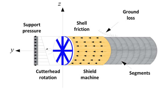 The well-known Mindlin’s solution [22], i.e., the solution for the concentrated load-induced displacement in a semi-infinite solid, is used for predicting the deformation caused by shield working loads. An integral method based on Mindlin’s solutions was used to calculate the deformation response of the EPB shield working loads, including the support pressure, shield shell friction, and cutter head rotation.