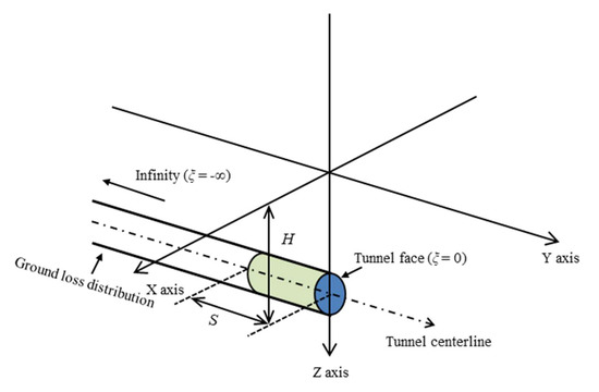 For general subway tunnels, their slopes are usually required to be gentle enough to meet train operation. Thus, the shield buried depth can be simplified as a fixed value within a finite driving length. Figure 7 shows the simplified ground loss distribution along the shield tunneling axis. As drawn in Figure 7, by integrating the Green functions of Equation (4) along the tunnel length from −∞ to –S, the ground deformation induced by ground loss can be written as: