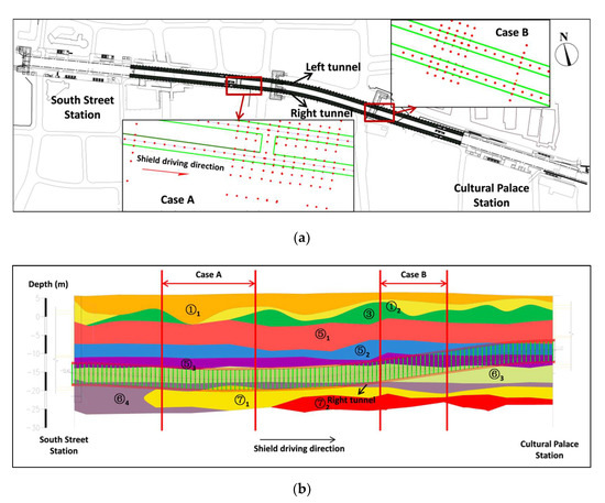 Shield tunnel between South Street station and Cultural Palace station. (a) plan view, (b) longitudinal tunnel sectional view.