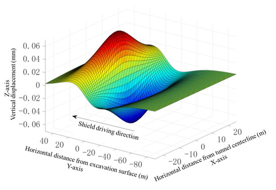 Figure 9, Figure 10, Figure 11 and Figure 12 present the calculated components of short-term ground deformations induced by shield driving, respectively, in which the Z-axis is taken as the vertical direction, Y-axis is taken as the shield driving direction, Y = 0 is where the tunnel face is located, and the x-axis is taken as the horizontal direction. As shown in Figure 9, the maximum surface settlement induced by the ground loss is 5.9 mm, and the settlement basin is mainly located in the region of −20 ≤ X ≤ 20 and Y ≤ −9, that is, behind the shield tail. As shown in Figure 10 and Figure 11, the vertical displacements caused by the support pressure and the shell friction are similar in shape. A spatial protrusion in the range of 0 ≤ Y ≤ 20 and a settlement basin in the range of −20 ≤ Y ≤ 0 are both observed. The maximum displacements caused by the shell friction and support pressure are 2.7 mm and 0.06 mm, respectively, which indicates that the shell friction f has a greater effect on the short-term ground deformations. As shown in Figure 12, the contribution of the cutter head rotation to the surface displacement is extremely small, with a maximum displacement of 0.002 mm, which is almost negligible.