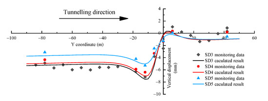 By superimposing all the displacement components in Figure 9, Figure 10, Figure 11 and Figure 12, the total ground surface deformation profile of case A can be obtained. Then the predicted total deformation was tested against the field monitored results, and the comparison results are shown in Figure 13. In general, the comparison between them shows a good agreement. As presented in Figure 13, the ground surface first rises ahead of the shield machine and then collapses behind it. A maximum positive displacement of about 2 mm is observed in the range of 0 < Y < 40, and a maximum negative displacement of about 6 mm is observed in the range of −40 < Y < 0. As shown in Figure 14, three columns of monitoring points, i.e., the SD3, SD4, and SD5 in Figure 13b, are selected for the comparison of longitudinal settlement in case A, of which the SD3 monitoring point is located directly above the tunnel centerline. It can be seen that in the range of the −20 < Y < 40, the prediction results show a great agreement with the monitoring results. However, in the range of −100 < Y < −20, the predicted value is lower than the monitored value. This can be attributed to the consolidation and settlement of the water-rich soft strata in the Changzhou area. After the soil layer is disturbed by shield tunneling, the excess pore water pressure gradually dissipates, resulting in long-term settlement. The empirical method proposed in Section 3 can be used to predict this long-term settlement.