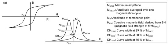 The magnetic Barkhausen noise analysis is based on the periodic magnetization by an applied alternating field. These materials consist of unidirectionally magnetized Weiss domains separated by Bloch walls. When a magnetic field is applied to a ferromagnetic material, the Weiss domains that are oriented approximately parallel to the applied field grow first by shifting the Bloch walls at the expense of less favorably oriented ones. Further alignment is achieved by rotating the magnetic domains [4]. The resulting relationship (hysteresis curve) between magnetic flux density B and magnetic field strength H is shown in Figure 1a [5,6]. The stepwise displacement of the Bloch walls leads to voltage jumps that can be made audible as a noise signal (BN) [7]. Plotting of the strength M of the noise signal against the field strength H leads to the profile curve shown in Figure 1b [8]. Depending on the manufacturer of the measurement technology, various characteristic values are derived from the curve. Figure 1 shows the measurement quantities of the 3MA-II technique from Fraunhofer IZFP. Other systems use, e.g., the root mean square of Barkhausen noise pulses [9]. Furthermore, wavelets [10,11] or Fourier Transformation [12,13] can be used to decompose the BN signal into frequency spectra. This allows for the extraction of useful components from the raw signal while eliminating disturbances [14].