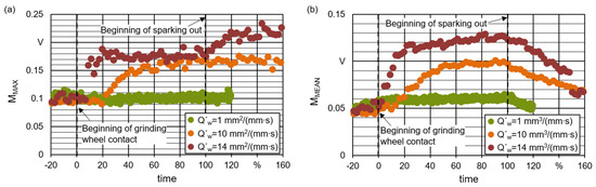Maximum BN amplitude MMAX (a) and averaged BN MMEAN (b) during grinding processes with different specific material removal rates Q′w on a workpiece of the heat treatment state 0.8/1/150.