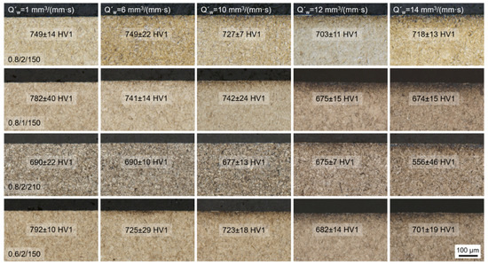 Figure 3 shows the micrographs of all ground states, the example discussed above (0.8/1/150) is revealed in the second row. The first micrograph (Q′w = 1 mm3/(mm∙s)) shows a surface state without any tempering effects while light tempering starts to occur for the second grinding process (Q′w = 6 mm3/(mm∙s)). With increasing Q′w, tempering zones (dark etching zones) become more pronounced and reach larger depths. The surface hardness given in the figure shows a trend of decreasing hardness with increasing tempering zones, with some scattering in the values. For all heat treatment states, damage-free surface states and increasingly pronounced tempering zones were generated, while no clearly identifiable rehardening was observed at the surface. However, the thickness of the tempering zones and the limit at which Q′w leads to visible damages differ between conditions. Especially for the higher tempered material state (0.8/2/210), tempering zones appear later. The influence of the heat treatment state on the grindability is not further discussed at this point, as it is already well documented in [15,16].
