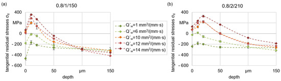 Depth profiles of the tangential residual stresses after grinding of heat treatment states 0.8/1/150 (a) and 0.8/2/210 (b).