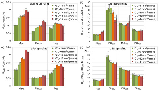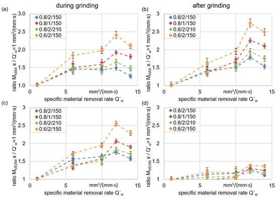 Ratio of BN values MMAX (a,b) and MMEAN (c,d) during and after grinding with different specific material removal rates and Q′w = 1 mm3/(mm∙s).
