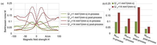 To understand the characteristics observed and described before, Figure 6a shows exemplarily some BN envelopes measured during and after grinding with different Q′w (directly before and after sparking out). The values MMAX and MMEAN derived from the envelopes are shown in the bar chart (b). For the condition ground with Q′w = 1 mm3/(mm∙s), peaks during and after grinding have the same height. This corresponds to Figure 2 and Figure 5. During grinding with Q′w = 14 mm3/(mm∙s), MMAX is around 0.17 V and increases to 0.22 V after sparking out. The reason for this change is not yet clear but might be an effect of worse contact, and a larger air gap between the sensor and the workpiece due to vibrations during grinding with high Q′w. As shown in [23], BN decreases with increasing distance between the sensor and the workpiece surface. Furthermore, it is noticeable that, during grinding, the BN in the saturation area (near ±100 A/cm) of the hysteresis curve increases. This effect is already visible at Q′w = 1 mm3/(mm∙s) but increases with higher Q′w. Reasonably, a superposition of the magnetization by a mechanical excitation, as described in [24], can be assumed. In [29], Theiner and Koblé described that the superposition of a magnetic excitation with a mechanical excitation of higher frequency especially increases the BN signal at higher and lower field strengths but not in the area of coercivity. This is explained by the different processes during magnetization. Near coercivity, a change in magnetization takes place due to shifts of the 180° Bloch walls [6] that are not magnetostrictive and therefore not affected by mechanical excitation [29].