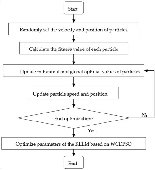 The WCDPSO algorithm is used to solve the parameter combinatorial optimization of the KELM model; the flowchart is shown in Figure 2.