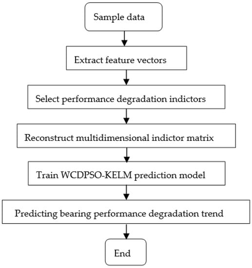 A flowchart of the performance degradation prediction model based on WCDPSO-KELM is shown in Figure 3.