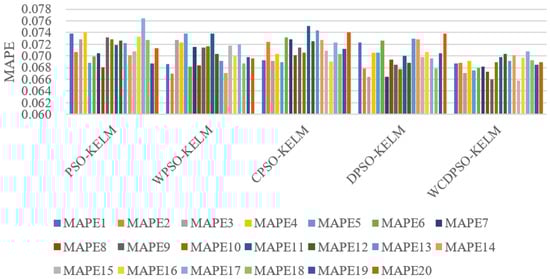 The performance of the WCDPSO-KELM model is compared with that of other models such as the PSO-KELM model, the WPSO-KELM model, the CPSO-KELM model and the DPSO-KELM model. In order to reduce errors and avoid randomness, each prediction model runs 20 times to calculate the average value and standard deviation. The MAPE values of various models are listed in Table 1 and shown in Figure 4.