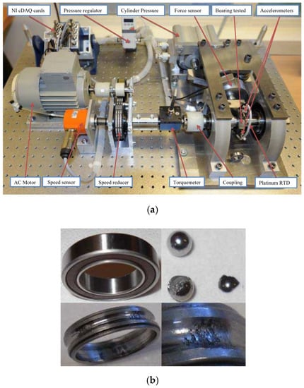 - Nectoux, P.; Gouriveau, R.; Medjaher, K.; Ramasso, E.; Chebel-Morello, B.; Zerhouni, N.; Varnier, C. Pronostia: An experimental platform for bearings accelerated degradation tests. In Proceedings of the IEEE International Conference on Prognostics and Health Management, PHM’12, Denver, CO, USA, 18–21 June 2012; pp. 1–8. [Google Scholar]