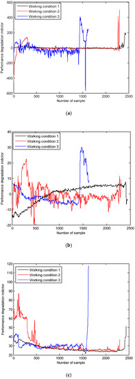Because the statistical index of the vibration signal contains rich information regarding rolling bearings’ running state, it can be used to assess performance degradation trends of rolling bearings or diagnose bearing faults. The running state of rolling bearings is effectively described by multiple time–frequency domain indexes of the whole life-cycle, then PCA is used to extract the first principal component from features of the time–frequency domain. Figure 6a shows performance degradation indexes from time–frequency domain features in three working conditions.