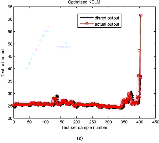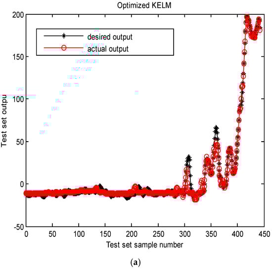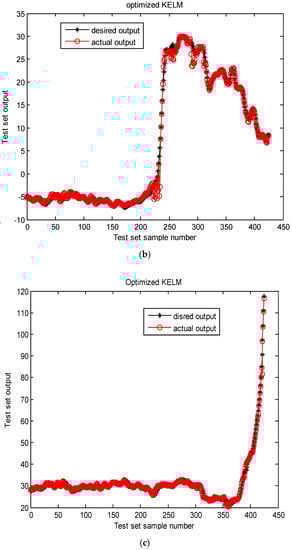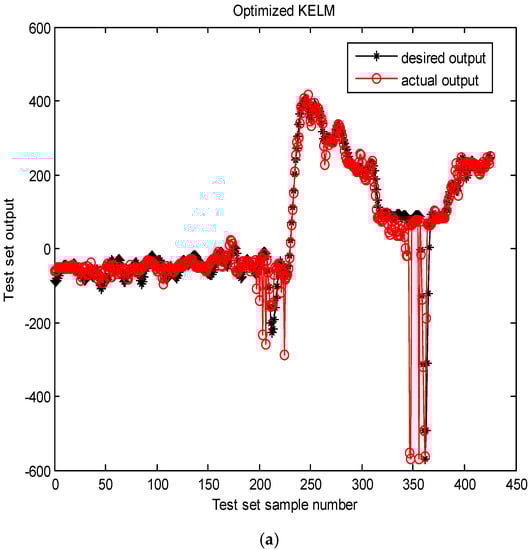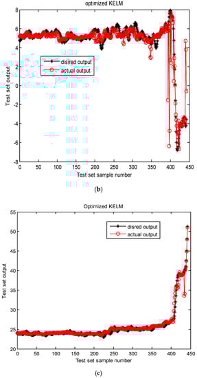 The sample data numbered bearing1_5 is processed according to Figure 3 to obtain performance degradation indexes of time–frequency domain, wavelet packet space and EEMD space. From a total of 2442 datasets, the first 2000 datasets are taken as training datasets, and the remaining 442 as the testing dataset. A different performance degradation index is input to the WCDPSO-KELM model. The outputs of the WCDPSO-KELM model and actual outputs are shown in Figure 7.
