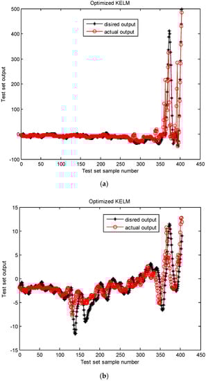 The sample data numbered bearing2_5 is processed as described above. From a total of 2304 datasets, the first 1900 datasets are taken as training datasets, and the remaining 404 as testing datasets. The outputs of the WCDPSO-KELM model and actual outputs are shown in Figure 8.