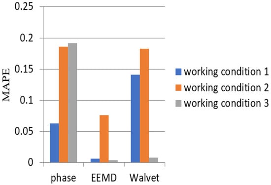 The performance degradation index of different feature spaces is input to the WCDPSO-KELM model to calculate the MAPE value. The MAPE values of the WCDPSO-KELM model are listed in Table 4 and shown in Figure 10.