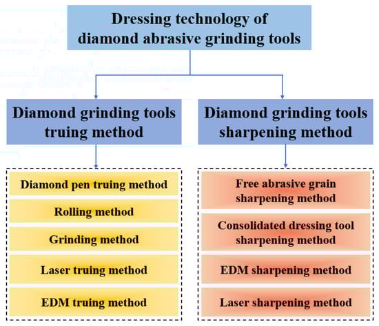 The dressing of diamond abrasive tools mainly includes two steps: truing and sharpening. Truing refers to cutting blunt diamond abrasive grains to make their tips finely broken and obtain appropriate shape accuracy to form a sharp grinding edge. Sharpening refers to removing the excess bond materials between diamond abrasive grains, making them possess appropriate chip holding space, and making the grinding edge higher than the bond to obtain the ideal abrasive grain height and form the cutting edge []. The dressing technology of diamond abrasive grinding tools has developed step-by-step from the traditional single “hard touch” dressing [], and a series of effective dressing methods have been obtained, as shown in Figure 1. It can be seen from Figure 1 that improvements in traditional machining technologies, such as the diamond pen truing method, grinding method, rolling method, free abrasive grain sharpening method, consolidated dressing tool sharpening method, and the innovation of new processing technologies, such as the electric discharge machining (EDM) dressing method and laser dressing method, can provide feasible schemes for the development of diamond abrasive grinding tools dressing technology.
