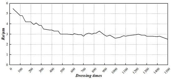 Due to its simple structure and low investment cost, the diamond pen truing method is widely used in the field of grinding, but the wear of the diamond pen is quite serious, and the shape accuracy and dimensional accuracy are not high, which affects the surface integrity of diamond abrasive grinding tools. The grinding surface roughness (expressed as Ra) gradually decreases with increase in dressing times (Figure 3). When the dressing times reaches about 500 times, Ra tends to be stable [], and the dressing efficiency is approximately 30∼40%. Therefore, scholars have sought to improve and develop the traditional diamond pen truing method which is organically integrated with other dressing methods. For example, based on the principle of vibration cutting, Zhao et al. [,] employed an ultrasonic vibration dressing method together with a diamond pen. This technology could eliminate the shortcomings of the traditional turning dressing of diamond pens and obtain good morphology, to achieve the purpose of improving the shape accuracy and grinding performance of the grinding wheel, and greatly improve efficiency.
