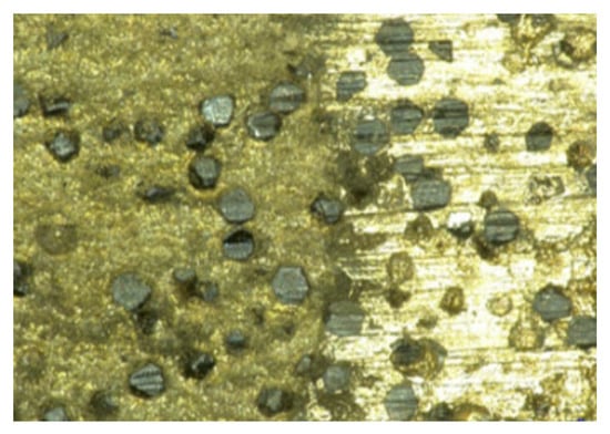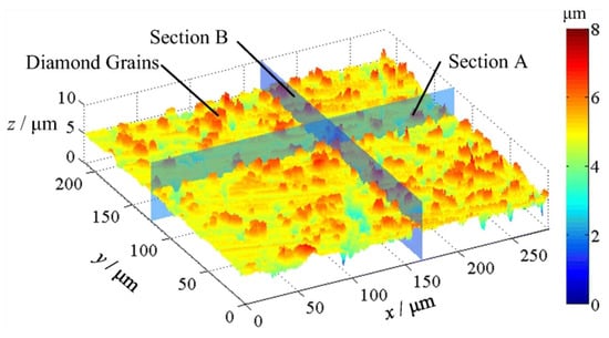 Drazumeric Radovan et al. [] studied the lateral dressing of diamond abrasive grinding wheels, which employed an Al2O3 or SiC dressing wheel to break and drop off the diamond abrasive grains and shortened the dressing time under the condition of constraining the dressing force through the basic relationship between geometry, kinematics, and the removal mechanism. Liang et al. [] studied the tangential grinding of V-shaped tips of resin-bonded and metal-bonded diamond abrasive grinding wheels with SiC dressing grinding wheels and found that both kinds of diamond abrasive grinding wheels after dressing could meet the requirements of microstructure processing. Figure 5 shows the topography of the diamond abrasive grinding wheel surface after dressing by the rolling method []. It was found that the diamond abrasive grains protruded from the bond material and had appropriate shape accuracy, and the dressing efficiency was approximately 45∼55%.