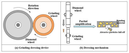 Consolidation dressing tool sharpening methods include the oilstone sharpening method, the ordinary grinding wheel grinding sharpening method, and the silicon carbide (SiC), or corundum block cutting sharpening method. These methods mainly utilize the difference in hardness between the sharpening tool and the diamond abrasive grains to make the abrasive grains fall off by cutting the bond material between the abrasive grains. The dressing effect is shown in Figure 10 []. Klink et al. [] employed internal cooling grinding tools and an electric corrosion process to dress the abrasive grains, which could achieve the ideal sharpening effect. Zhou et al. [] dressed the diamond abrasive grinding wheel through three-axis linkage circular arc interpolation movement, which had a simple structure, high dressing accuracy, and high processing efficiency. Chen et al. [] used three-axis linkage machine tools and sharpening tools, such as carbide grinding rods, to dress resin-bonded V-shaped diamond abrasive grinding wheels to achieve accurate in situ dressing. Xue [] designed a twist drilling device for dressing diamond abrasive grinding wheels with a large dressing area, high efficiency, and high accuracy. Liu et al. [] employed oilstone as a grinding tool to remove the bond material of the diamond abrasive grinding wheel and drove the oilstone to dress the end face of the grinding wheel by rotating the dressing shaft. This design was effective, low cost, and showed an ideal dressing effect.