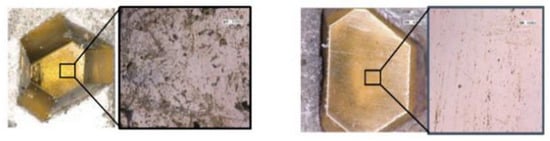 The surface effect of electric machining truing aluminum-based diamonds is shown in Figure 8 []. It was found that the surface of the diamond abrasive grains was smooth and bright, and the grinding edges were sharp. The EDM truing method had a high dressing efficiency of approximately 60∼70% and had certain advantages in machining workpieces that could not be machined by conventional machine tools, but it had disadvantages in machining non-conductive materials. Moreover, the power supply of the electrolytic machining method was expensive and the EDM truing method was difficult to process due to the existence of a discharge gap. Especially for large abrasive grains, it was difficult to process. Therefore, lasers began to be applied to truing diamond abrasive grinding tools.