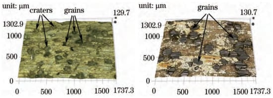 Figure 16b–d shows the temperature change of pulsed fiber laser dressing diamond. When the laser power density was 1.68 × 108 W/cm2, as shown in Figure 16b, the maximum temperature of the diamond surface after the dressing was approximately 3800 K, which was slightly higher than the melting point temperature of diamond (3550 K). Due to the short dressing time of the pulsed laser, the laser energy had little effect on the diamond abrasive grains and they maintained their original shape. When the laser power density increased to 2.52 × 108 W/cm2, as shown in Figure 16c, the maximum temperature of the diamond surface reached 5900 K, which was higher than the gasification temperature of the diamond (4830 K). At this point, the laser energy can gasify the diamond in a short time, therefore the diamond abrasive grains were obviously deformed, and the truing effect of the diamond abrasive grinding tools was achieved. With gradual increase in the laser power density to 3.36 × 108 W/cm2, as shown in Figure 16d, the maximum temperature of the diamond surface was as high as 7850 K. Excessive laser energy can lead to a large amount of diamond removal. However, due to the short time of pulsed fiber laser dressing of the bronze-bonded diamond abrasive grinding wheel, only part of the diamond will be removed, leaving large or small pits on its surface.