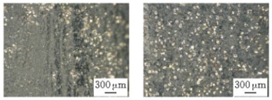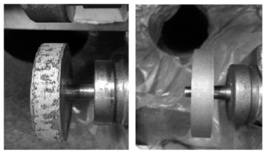 Figure 13 shows a comparison of the grinding wheel surface before and after EDM dressing []. It can be seen from the figure that the grinding wheel surface after the dressing is smooth and flat, the outer contour is clear and has a sharp cutting edge. The research showed that the dressing efficiency of the EDM sharpening method was high—approximately 50∼60%. After dressing, the surface of the abrasive grinding tool had chip space, and the abrasive protruding bond height was ideal.