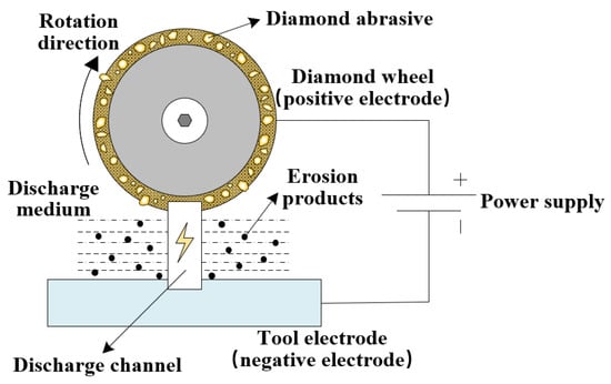 EDM sharpening methods mainly include the EDM dressing method and the electrolytic online dressing method. EDM grinding wheel dressing technology was first proposed by Suziki et al. []. Figure 11 shows a schematic diagram of the EDM dressing technology. The diamond abrasive grinding tool rotates clockwise and is connected to the positive pole of the power supply, while the tool electrode is connected to the negative pole of the power supply. The discharge medium, such as working fluid, is introduced between the diamond abrasive grinding wheel and the tool electrode to make the pulse voltage pass through, thereby generating a pulsed spark and forming a discharge channel. The phenomenon of electric corrosion eliminates the bond material and achieves the purpose of sharpening the diamond abrasive grinding wheel. Yu et al. [] conducted experimental research on EDM dressing of the bronze-bonded diamond abrasive grinding wheel using an internal impact arc copper tungsten electrode and found that the surface abrasive grains were prominent, large in number, and high in density.