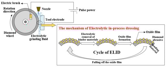 Electrolytic in-process dressing technology (ELID) was developed in Japan in the early 1990s for precision mirror grinding of dressing grinding wheels. Figure 12 shows a schematic diagram of the electrolytic in-process dressing technology. The working principle of ELID is to use tool electrodes and diamond abrasive grinding wheels as cathode and anode, while the nozzle sprays special electrolytic grinding fluid between the two poles. Under the action of the power supply, the diamond abrasive grinding wheel is dressed online through the anode dissolution effect. When the bond material is eroded, a layer of dense oxide film is formed on the surface of the grinding wheel, which can slow down the electrolysis speed, prevent excessive electrolysis and avoid excessive wear of the grinding wheel. However, as the oxide film becomes thinner and the conductivity increases, the electrolysis speed of the bond materials is accelerated to realize the cycle of online electrolytic sharpening. During the sharpening process, the surface of the grinding wheel can maintain the most ideal morphology and achieve ultra-precision mirror grinding. Chen et al. [] proposed an ultrasonic-assisted electrolytic process sharpening method, which combined the high-frequency ultrasonic vibration method with the electrolytic method in parallel and carried out comparative experiments on this. It was found that the method could improve the removal rate and machining surface quality and overcome the difficulty of continuous dressing of the fine diamond abrasive grinding wheel in the machining process. Kundrák et al. [] found that electrochemical machining could remove the metal bond to make abrasive grains protrude and maintain their cutting ability.