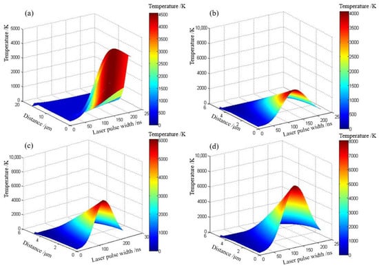 Since kΔt/(ρc(Δx)2) is less than 0.5 for both the bronze and diamond cases, the numerical solution is stable and convergent. The temperature evolution law of the bronze bond and diamond abrasive grains dressed by pulsed fiber laser was obtained by computer programming through MATLAB, as shown in Figure 16.