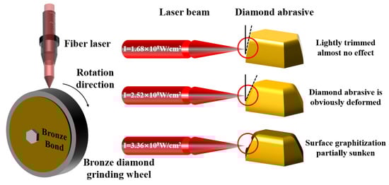 Figure 14 shows a schematic diagram of the laser sharpening diamond abrasive grinding tool. Its working principle is that the laser beam, with a certain power density, is directly irradiated on the diamond abrasive grinding tool as a “processing tool”, and the surface temperature of the grinding tool rises rapidly. Using the difference between the melting point of the bond material and the diamond abrasive grains, the bond material is heated, melted, and gasified, then separated from the diamond abrasive grinding wheel in a gaseous or plasma state to achieve the purpose of sharpening.