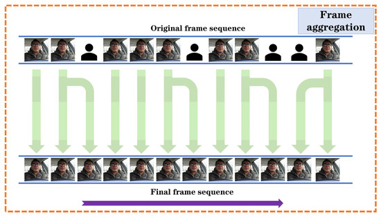 In the actual driving environment, the phenomenon of missing detection of the driver’s facial features (camera occlusion, driver nodding, etc.) may occur. In order to ensure the accuracy of detection effect and maximize driver safety, frame aggregation is used to overcome the phenomenon of missing detection. In a certain consecutive frame, if there is no face detected in a certain frame, an adjacent frame is used to replace the image of this frame so as to ensure that the driver’s face image is always clearly detected in every frame of the video stream. The specific operation principle of this strategy is shown in Figure 3.