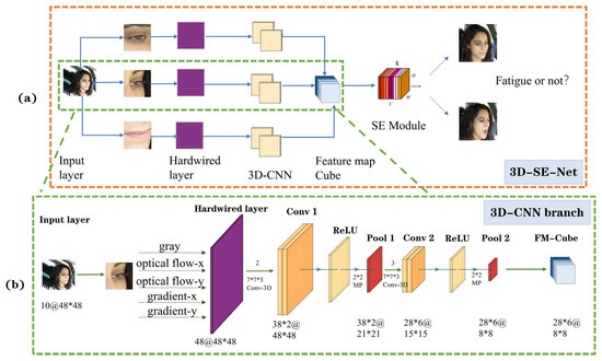 In the following, we describe our 3D-SE-Net fatigue detection architecture in depth. As shown in Figure 4a, the proposed framework consists of three branches, each with the same convolution and pooling operations, which are trained on images of the driver’s left eye, right eye and mouth. After acquiring the grey-scale, gradient and optical flow images of the driver’s video frame, the feature maps are passed into the corresponding 3D-CNN branches, each containing two 3D convolution operations and two max-pooling operations. The feature maps of each branch are merged together to generate a feature map cube and finally to enter the SE module [20] to compress and excite the features on the feature channels and then re-assign the weights to each channel to obtain the final fatigue recognition result. In order to prevent the gradient from disappearing and to keep the convergence rate of the model in a steady state, each 3D convolution operation is followed by a linear rectification function (ReLU) [21] as the activation function, which facilitates the fitting of the training data while preventing overfitting to a certain extent.