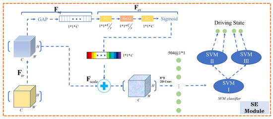 After feature extraction by 3D-CNN, the feature map contains rich spatial and channel information and then we use the Squeeze-and-Excitation (SE) module [20] to perform ‘feature rescaling’ on the feature map. The SE module is not a complete network but a module for feature learning and redistribution. The common convolutional neural network is usually an information aggregator that aggregates spatial information and channel information on the local receptive field, while the SE module adopts a strategy of ‘feature rescaling’ to explicitly model the interdependence between feature channels. To be specific, it is to automatically acquire the importance of each channel through learning, and then promote useful features according to this importance and suppress features that are not useful for the current task. In our proposed 3D-SE-Net, the driver’s facial features are reconstructed using the weight matrix learned by the SE module, which has two main operations: Squeeze and Excitation, as described below.