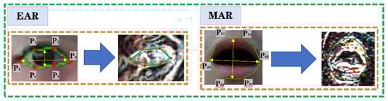 When the eyes and mouth are open, their aspect ratio is usually constant, while when they are closed the value of the aspect ratio is close to 0. This ratio does not change with individual human differences. Therefore, in the proposed model, we use EAR [23] and MAR [24] to assess the fatigue state of the driver.