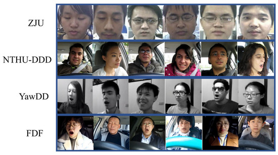 FDF dataset: The fourth dataset was designed and collected fully in-house and we have named it the FDF dataset. This dataset contains a total of 16 people, both with and without glasses, and the test environment includes both daytime and nighttime scenarios. To ensure the objectivity of the data, our dataset was collected in a real driving environment. The subjects’ driving states included ‘Normal’, ‘Talking’, ‘Sleepy-nodding’ and ‘Yawning’, and we eventually acquired 5360 images of the driver’s facial state from the video frames.