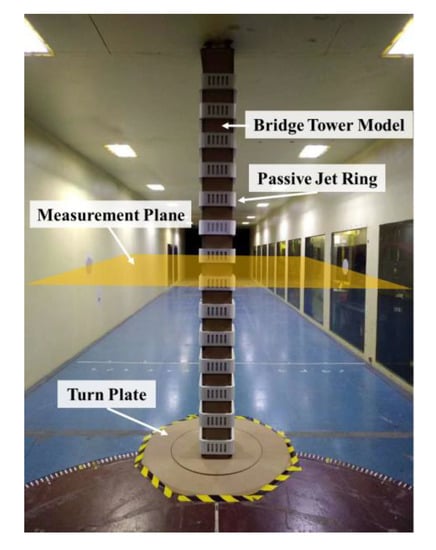 The WIV of suspenders was found to be caused by the vortices from the bridge tower shedding into the tower wake [9,24]. Therefore, in this paper, we aim to further apply this passive jet apparatus to the bridge tower to modify the characteristics of the wake. We conducted an experiment to measure the time histories of wind speed at each measurement point. The experiment setup is introduced in Section 2, the results of tower wake characteristics are shown in Section 3, and finally, a discussion and conclusions are presented in Section 4.