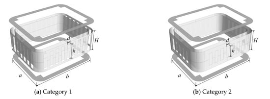 The present study adopts four kinds of passive jet rings to take control of the tower wake flow, which refers to the design in Chen et al. [23]. The ring is an annular flow channel with slits made by a 1 mm thick plastic plate, as Figure 2 shows. The top view of the ring is a rounded rectangular box, of which the outer size is 323 mm × 257 mm, with a 43 mm radius rounded corner in each corner, and the inner size is 283 mm × 217 mm; thus, it can closely fit the tower model. The intermediate part of 18 mm thickness, considering the thickness of the plate, constitutes the hollow flow channel. The height of the passive jet ring is 100 mm. Several rectangular slits are distributed around the side walls of the ring. The major differences between these four categories of jet ring are the size and the distribution of these slits. The size of slits in the first and third categories is 80 mm × 30 mm, and that in the second and fourth categories is 60 mm × 30 mm. For the first category, there are nine and seven slits on each long and short side, respectively, and for the second category, there are seven and five slits. For the third and fourth categories, the slits of the first and second categories on the long side are sealed, seven and five slits are distributed on each short side, respectively, and no slits are arranged on the long side. The clear spacing between two slits on each side is 30 mm. All the slits adopt axisymmetric distribution on both two principal axes.