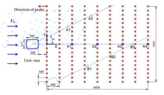 In this experiment, a four-hole pressure probe (Series 100 Cobra Probe, Turbulent Flow Instrumentation Pty Ltd., Victoria, Australia) was used to measure the characteristics of the bridge tower wake flow. There are 172 measurement points in the zone of tower wake, distributed on a 2.4 m × 1.8 m horizontal plane 1.5 m above the ground (half of the wind tunnel section height), as shown in Figure 1. In this plane, nine rows perpendicular to the incoming flow distribute at the interval of 300 mm, and nineteen columns parallel to the incoming flow distribute at the interval of 100 mm. The middle measurement point in the first row is 200 mm away from the back of the tower model. Taking the same scale ratio as the tower model, the realistic locations of four suspenders behind the bridge tower correspond to the middle points in rows 3, 5, 7, and 9. The measurement points distribution can be seen in Figure 3. At each measurement point, the sampling frequency is 625 Hz, and the sampling time is 20 s.