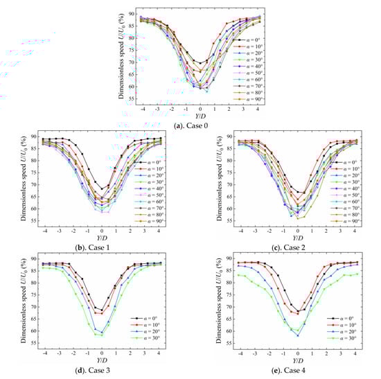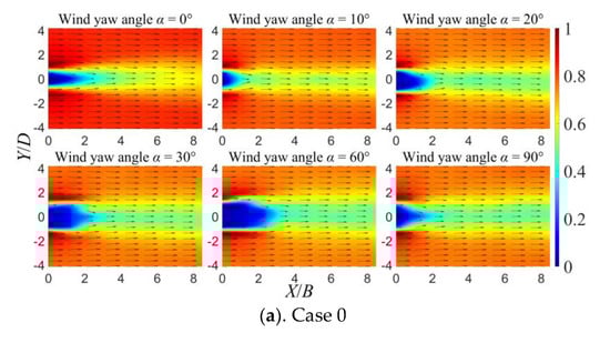 To show the distribution of the velocity on the Y-axis, Figure 6 adopts the velocity of measurement points in the final row (X/B = 8.48) in different cases. The trend of velocity is consistent in all cases. The distribution on the Y-axis shows the shape of a saddle, and the velocity increases first and then decreases as the yaw angle increases. It can be indicated that the passive jet ring significantly modifies the velocity in the near wake but slightly changes the velocity distribution further downstream.