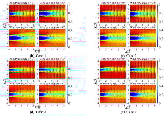 Figure 4 shows the mean dimensionless speed (U/U0) distribution in each test condition, where the black arrows refer to the local wind velocity vector. The general distribution trend of wind velocity is almost the same, and it can be divided into three regions. A low-value zone is located near the position (0, 0), which can be regarded as the low-speed region. This region is created due to the bridge tower shielding effects and the recirculation zone. Due to the limitation of the cobra probe, the mean velocity is always downstream, which is not tally with the fact; thus, the low-speed region is defined as the location where the data acceptance ratio (the proportion of non-zero data) of the probe is less than 50%. A slow diffusion region is located downstream of the low-speed region, where the speed is approximately half of the incoming wind speed. The high-speed region is distributed on two sides of the Y-axis, where the mean speed is almost not affected by the bridge tower model.