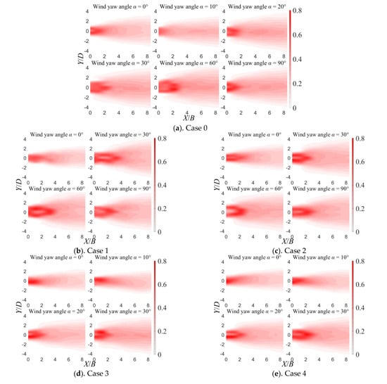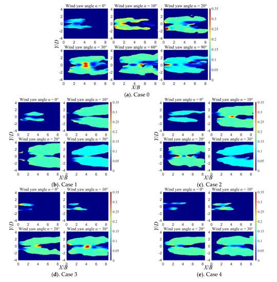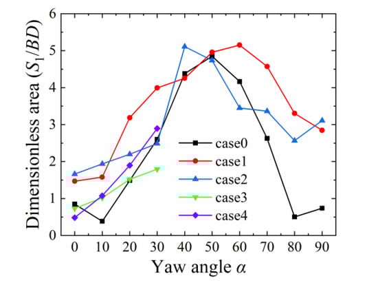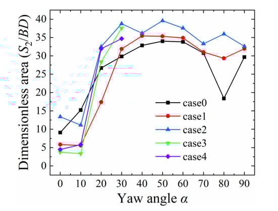 In Cases 3 and 4, the distribution region shrinks to 0 and 10 degrees. For a better comparison of the area change in the distribution region, Figure 10 shows the dimensionless area (S2/BD) of the region in each case. The threshold value of PSD is also set as 0.5. Two trends in different sections of the yaw angle appear. When the yaw angle is small (0–10 degrees), Cases 1, 3, and 4 all reveal a great control effect. Cases 1–4 attain [36.0, −47.2, 59.1, 50.6] and [63.3, 26.9, 78.0, 61.9] percent reduction of area in 0 and 10 degrees, respectively. However, when the yaw angle increases, the area expands, where Case 1 shows the least expansion, except at 80 degrees, with no more than 4% of the area expanding. As in the turbulence intensity distribution, a drop of the area appears at 80 degrees in Case 0, which causes the amplification of the negative control effects of all cases at 80 degrees. Case 2 has the same trend of the area variation by degrees as Case 1, but the effect is worse—29% amplification of area is the maximum at 30 degrees, without considering 80 degrees. Cases 1 and 3 have larger suction coefficients, so these cases perform better than others. If only a small yaw angle is taken into consideration, Case 3 would be recommended, because the position of the suspenders would come out of the wake region at large yaw angles. For engineering applications, Case 1 would be better for various yaw angles.
