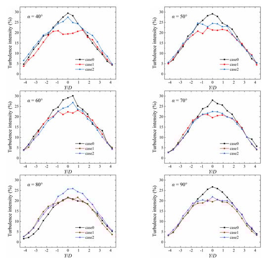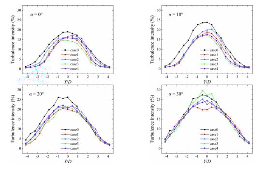 To quantitatively compare the turbulence intensity, Figure 8 shows the turbulence intensity distribution in the row at X/B = 8.48, where the turbulence is totally diffused, and the acceptance ratio is 100%; thus, the deviation can be averted. At 0 degrees, Case 3 shows the best control effect, the peak value reduces by 19.3%, and the width of the wake decreases evidently; other cases show more or fewer control effects. At 10 and 20 degrees, all cases control the turbulence effectively. Case 3 and Case 4 attain the best consequence, which reduces 32.5% and 30.2% at 10 degrees and 17.9% and 20.7% at 20 degrees, respectively. When the yaw angle comes to 30 degrees, Case 3 has no control effect but amplifies the peak value for 7.4%, while Case 1 gains the best effect for a 32.5% reduction. The suction coefficient and flow transmission loss can elucidate this variation trend rationally. When the yaw angle is small (0–20 degrees), the differences in the suction coefficients between Cases 1 and 2 and Cases 3 and 4 are small, but the flow would leak from the side slits in Cases 1 and 2, which induces the abating of the jet flow. Hence, Cases 3 and 4 perform better in small yaw angles. As the yaw angle continuously increases, Cases 1 and 2 obtain larger suction coefficients than Cases 3 and 4; on the other hand, because each side functions as a suction or jet wall, no conception of leakage would exist, so Cases 1 and 2 can perform better at a large yaw angle. This is the reason that Cases 3 and 4 are only conducted at 0–30 degrees. A similar phenomenon also appears in the study of the application to a circular cylinder (Chen et al., 2015), where five pairs of slits perform better in wind fluctuating load suppression than 13 pairs of slits. At 40–90 degrees, Cases 1 and 2 gain a control effect in most degrees, and generally, Case 1 performs better. Case 1 attains the control reduction of [34.1, 26.8, 27.7, 30.2, 0.8, 27.0] percent at 40–90 degrees and Case 2 attains the control reduction of [6.6, 15.9, 10.9, 19.7, −18.5, 18.0] percent. Notably, at 80 degrees, Cases 1 and 2 have no control effects—Case 2 even has a negative reduction. The turbulence of Case 0 has an obvious decrease at 80 degrees, which needs to be further explained. The general tendency indicates that Case 1 would have considerable control effects in different yaw angles because the suction coefficient of Case 1 is the largest. The larger the suction coefficient, the better control effects.