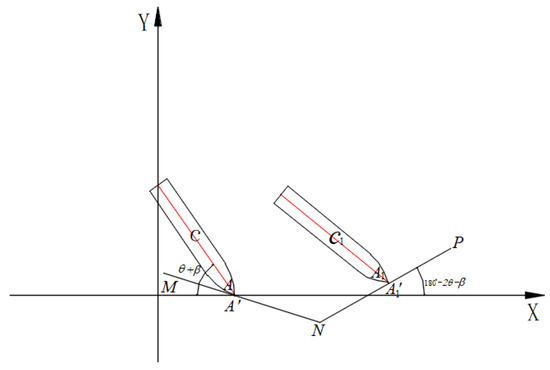 where is the angle between the and axis, and is the distance from the incidence point to , which is the intersection of and axis. When Equations (9) and (10) are jointly computed, the relationship of , and is derived as: