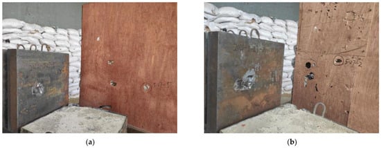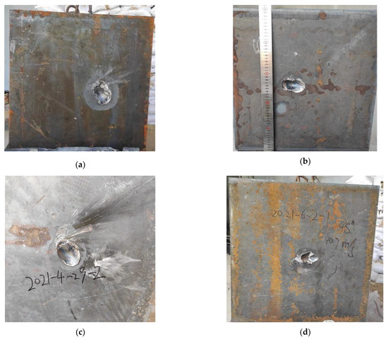 After the ballistic tests, each impacting site was subjected to detailed examination. The holes on the target plate and wood board were photographed, and the representative craters at different striking velocities and obliquities are presented in Figure 7. No damage was found on the back face of all the target plates (Figure 8), which could be assumed half-infinite. The fronts of the impacted plates were examined, and the damage patterns and the deformation mode of the plate during oblique penetration were defined. It can be noted that, due to the heavy heating effect and deformation, the flow of the material is the maximum and creates the petaling and crater damage patterns. Metal chipped away from the front surface by the projectile impacting under a lower attack angle is negligible.