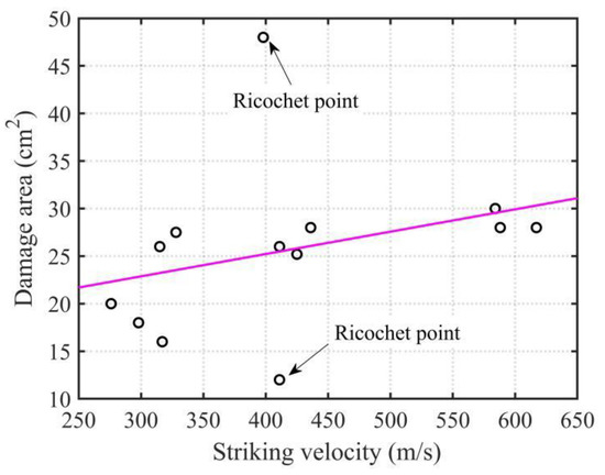 All the damage areas at the front face of the impacted plates were measured carefully after the ballistic impacting. First, with the help of trace paper, the impression of the damage areas was drawn on the paper. Then, putting it onto graph paper, the areas were measured. The damaged areas were plotted against the striking velocity at varying obliquities of impacting, and the results at a 30° angle of attack are shown in Figure 9. It could be observed that the damage area had a nearly linear increase with the increasing striking velocity. However, there were abrupt changes in the damaged area of the front face when a ricochet occurred. The maximum damage area was observed at the striking velocity of 398 m/s, while the minimum damage area was observed at the striking velocity of 411 m/s, and both of them were observed at a 30° angle of impacting. When the striking velocity was 398 m/s, the penetration depth was less than that of the projectile with a velocity of 411 m/s. Its possible cause was that the former flight projectile was mainly dominated by a lateral force, it grazed the target greatly, and the contact area was larger, but the latter one was controlled by a normal force, as the damage was mostly generated under the rebound action of the rigid body. In addition, dependent on the flight attitude of the projectile after firing, the damage power and area may have also made a difference.