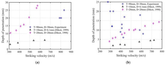 The depths up to which the projectile penetrated into the target plates at different obliquities and velocities were experimentally measured. The results of the penetration depths varying with the striking velocity at 15° and 30° angles of attack were, respectively, compared with those from Dikshit (1998 and 1999), as displayed in Figure 10a,b, where T represents the thickness of the impacting plate, and D represents the diameter of the projectile.